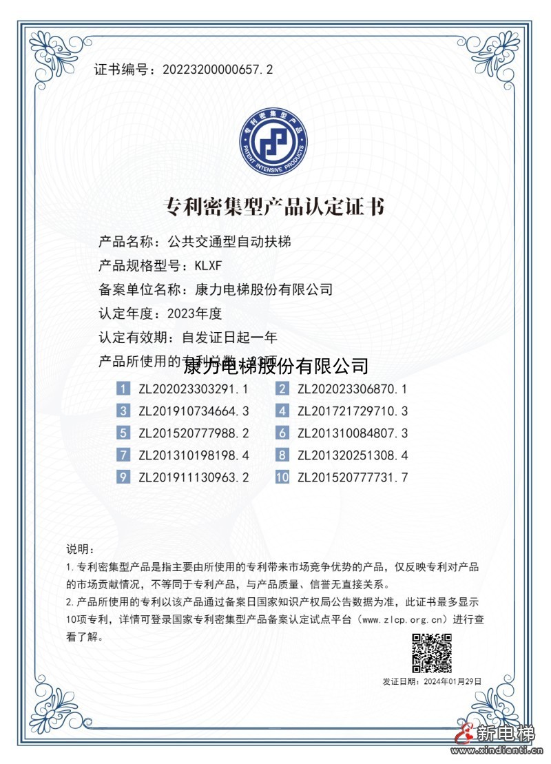 专利密集型产品认定证书 产品名称:公共交通型自动扶梯 产品规格型号:KLXF 备案单位名称:康力电梯股份有限公司 认定年度:2023年度 认定有效期:自发证日起一年 产品所使用的专利总数:23项 ZL202023303291.1 ZL201910734664.3 ZL201520777988.2 ZL201310198198.4 ZL201911130963.2 ZL202023306870.1 ZL201721729710.3 ZL201310084807.3 ZL201320251308.4 ZL201520777731.7 说明: 1.专利密集型产品是指主要由所使用的专利带来市场竞争优势的产品,仅反映专利对产品的市场贡献情况,不等同于专利产品,与产品质量、信誉无直接关系。 发证日期:2024年01月29日 证书图片 |