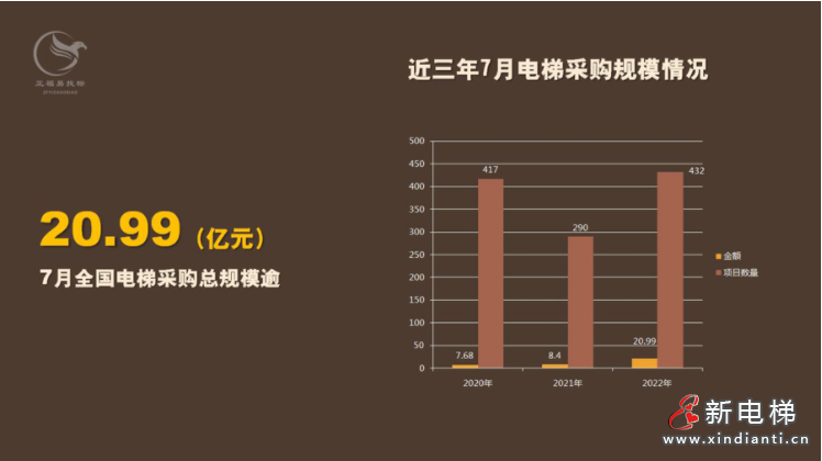 电梯采购是政府采购重要内容之一,近三年全国通过公开招标等方式来看,2020年7月全国电梯采购规模7.68亿元,2021年7月全国电梯采购规模8.4亿元,在轨道交通电梯采购需求加持下,2022年7月全国电梯采购规模逾20.99亿元,环比增长23.98%,同比增长149.88%。