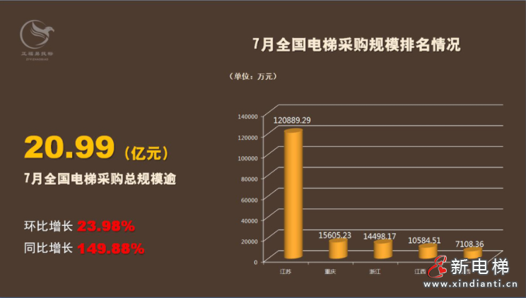 从电梯采购规模排名来看,7月,位列全国电梯采购规模排名前五的是江苏、重庆、浙江、江西和山西,总采购规模分别为120889.29万元、15605.23万元、14498.17万元、10584.51万元和7108.36万元。