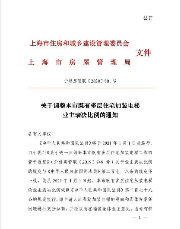 日前,上海市住建委、上海市房管局联合发布《关于调整本市既有多层住宅加装电梯业主表决比例的通知》,经参与表决专有部分面积四分之三以上的业主且参与表决人数四分之三以上的业主同意。