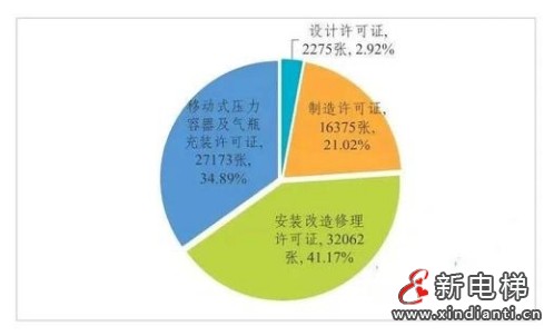全国共有特种设备生产(含设计、制造、安装、改造、修理)和充装单位76366家,持有许可证77885张,其中:设计许可证2275张,制造许可证16375张,安装改造修理许可证32062张,移动式压力容器及气瓶充装许可证27173张。(见图2)