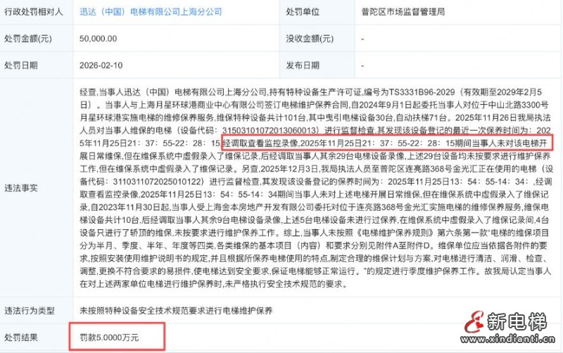 迅达(中国)上海分公司因虚假维保被罚款5万元