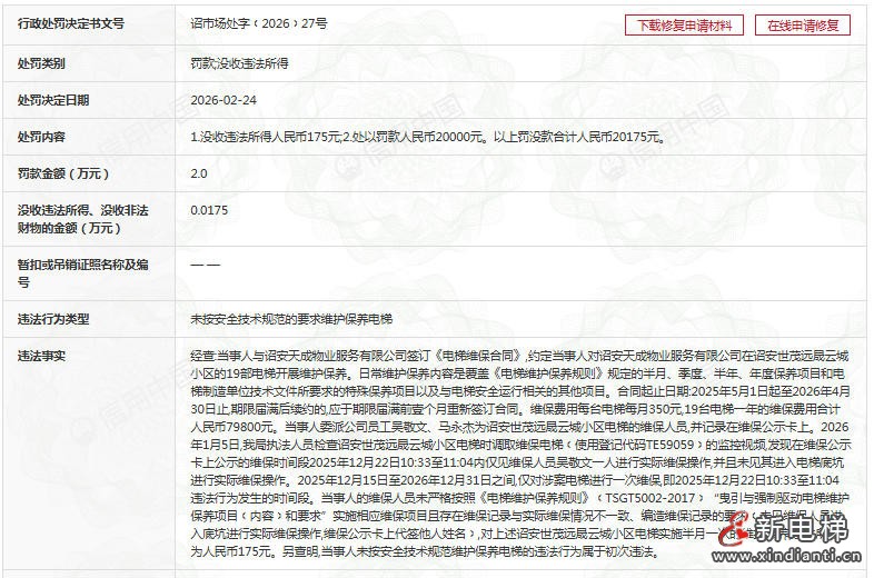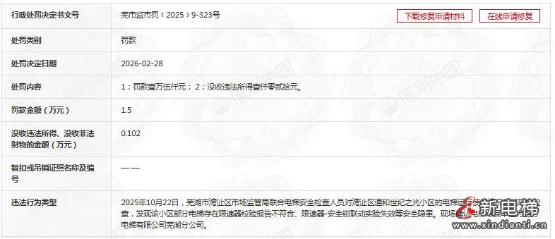 通力电梯芜湖分公司因维保不合规被罚款1.5万元