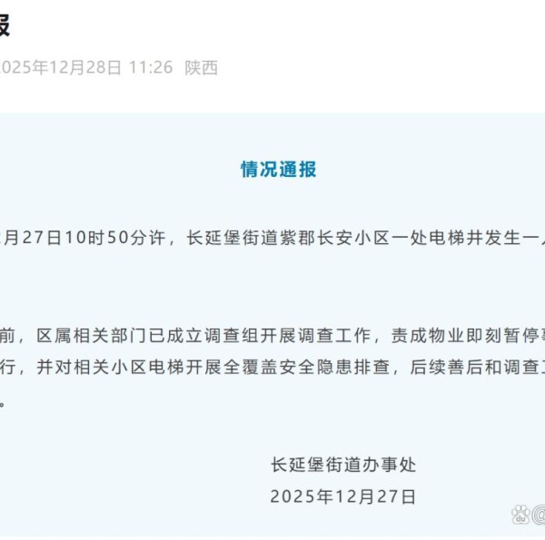 12月27日10时50分许,长延堡街道紫郡长安小区一处电梯井发生一人死亡事件。目前,区属相关部门已成立调查组开展调查工作,责成物业即刻暂停事发楼宇电梯运行...[详情]
