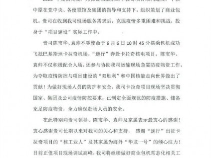 中核集团为东南电梯发来的感谢信,感谢“逆行”出征卡拉奇项目的“核工业人”及其家属为 海外“华龙一号”的倾心注力!感谢东南电梯为中国核电走向世界做出了...[详情]